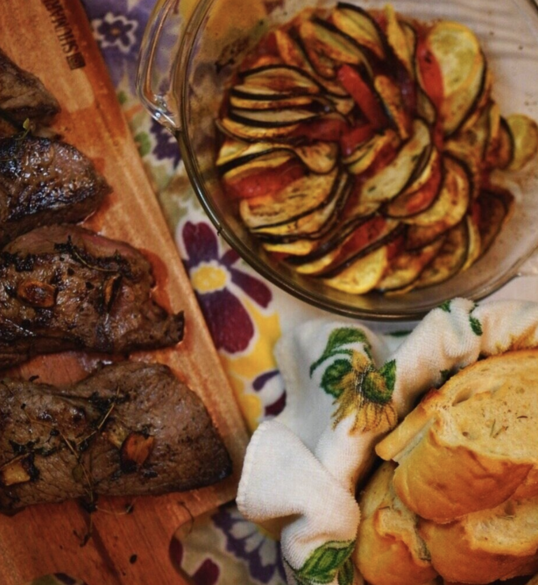 This fall-time meal was intended to be warm, cozy, and hearty. The ratatouille compiled a thinly-sliced medley of yellow squash, zucchini, and eggplant, served in a tomato-based sauce. It was accompanied by crusty French bread (bakery-acquired, as my sourdough failed miserably a story for another time), and a thick flank of steak.